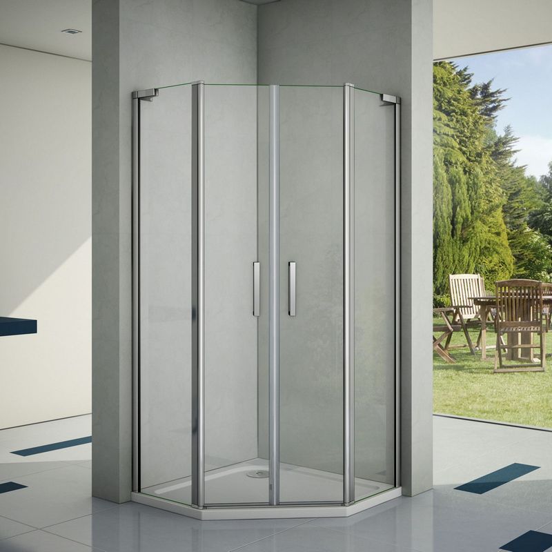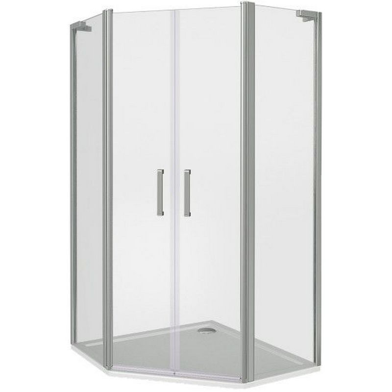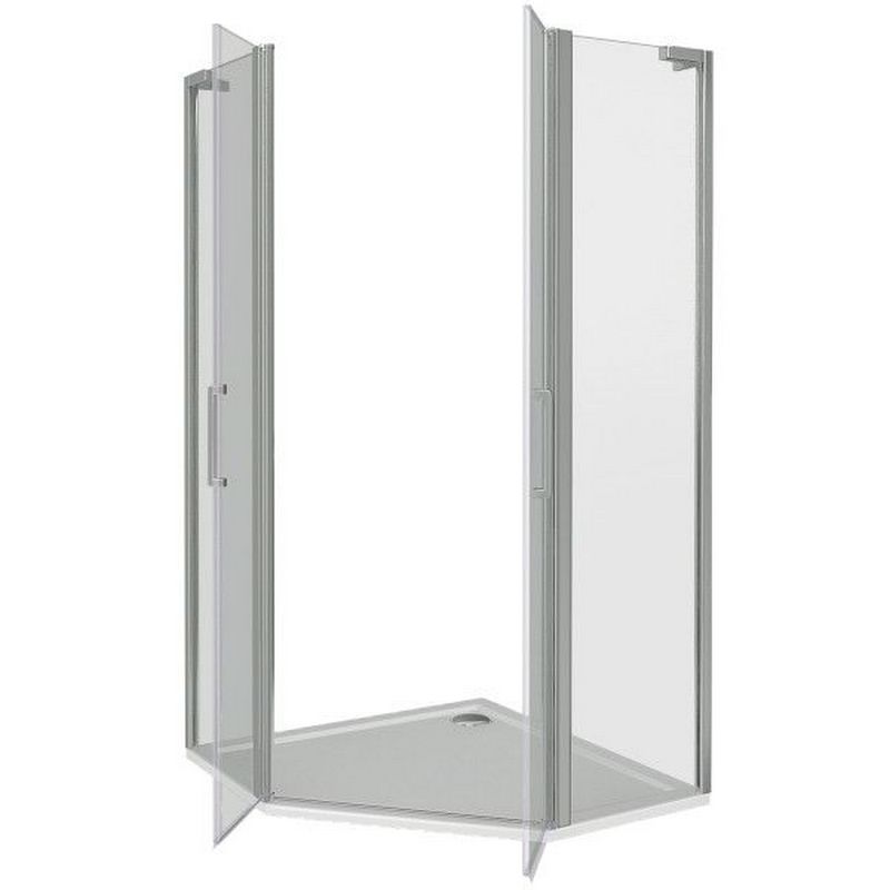 - Пятиугольный душевой уголок с двойными распашными дверями, открывающимися как внутрь, так и наружу