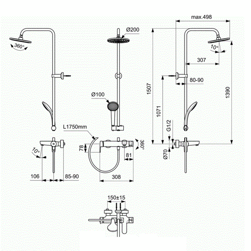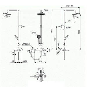 - удлиненная душевая труба (1507 мм.) для верхнего душа