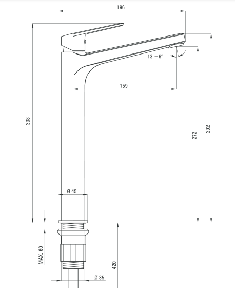 - Охват крана: 159 мм
