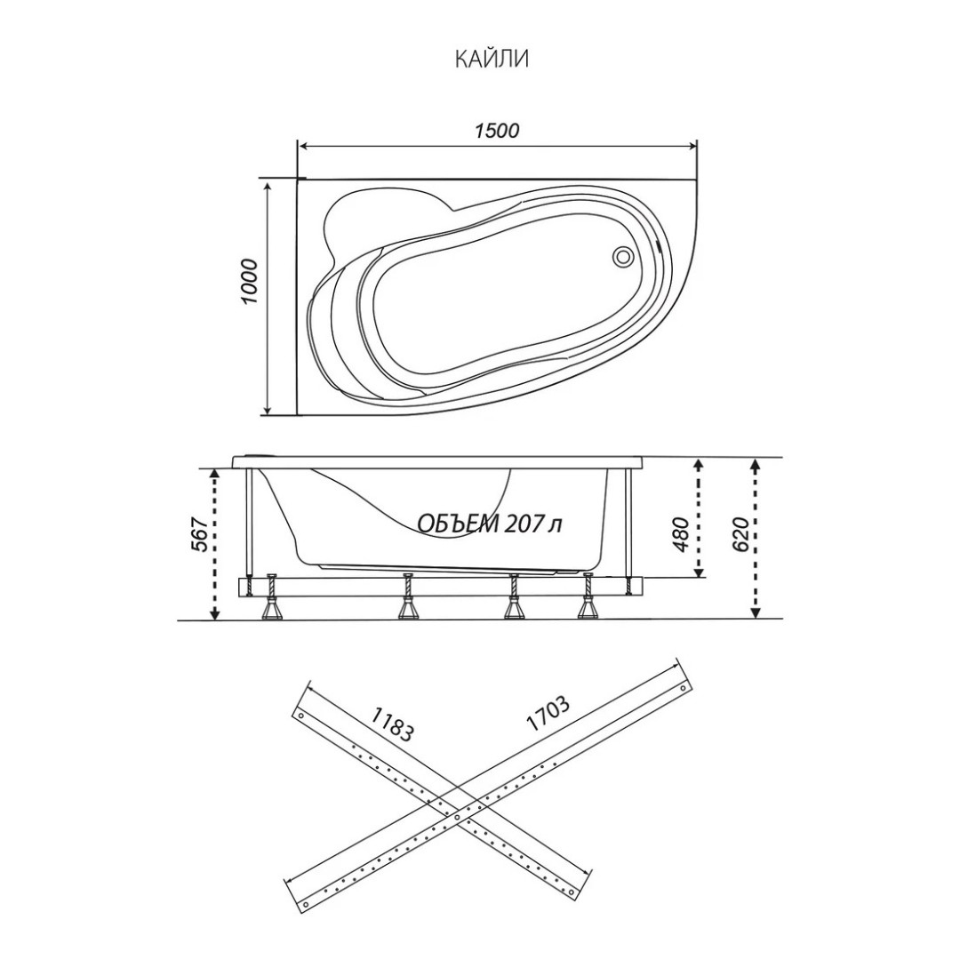 - Объем ванны — 207 литров